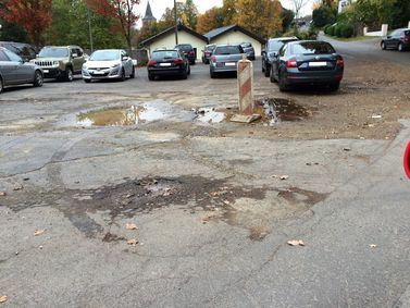 „ Auf dem Platz befinden sich nun mehrere großflächige Asphaltlöcher. Im größten Schlagloch steht eine unbeleuchtete Bake. Die schon bei o.a. Baubeginn nur noch rudimentär vorhandenen Markierungen für Parkplätze und den Straßenverlauf sind nun überhaupt nicht mehr zu erkennen. Das führt dazu, dass bei Veranstaltungen auf dem Platz kreuz und quer geparkt wird. Als Folge davon werden Anlieger beim Erreichen ihrer Grundstücke behindert, und die Feuerwehr kann schlimmstenfalls Objekte an der Straße „Am Ehrenmal“ nicht mehr ungehindert erreichen.“