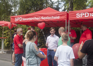 Seelscheider Sommer; ja das war am vergangenen Sonntag nicht nur das Motto der Werbegemeinschaft NeunkirchenSeelscheid, nein, es war auch wirklich Sommer in Seelscheid. Bei sommerlichen Temperaturen und Sonnenschein boten die Sonnenschirme und Pavillons unseres Standes nicht nur den optischen Hinweis auf die SPD vor Ort, sondern boten auch einen schattigen Platz für einen Plausch, der mal mehr, mal weniger politische Züge trug.